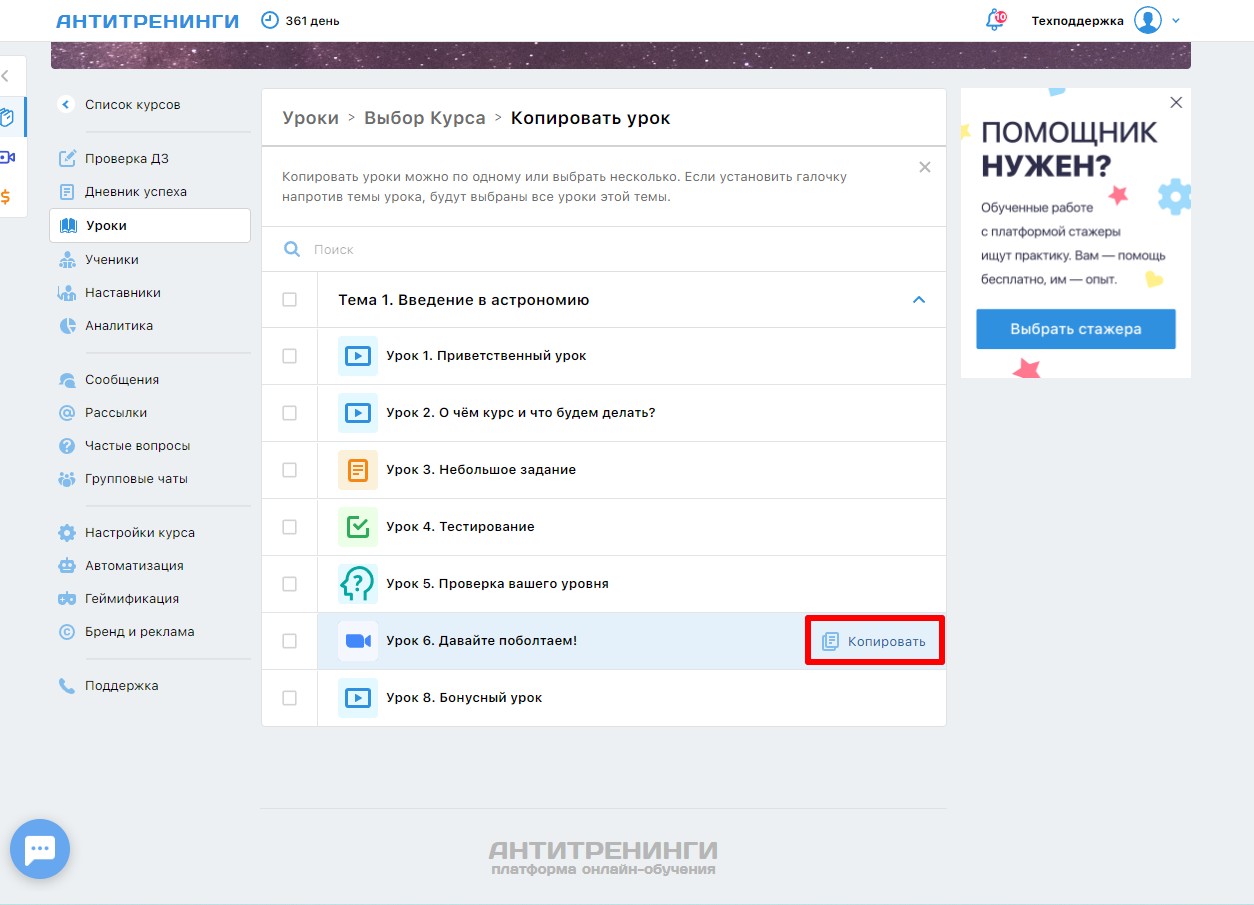 2. Выбрать нужную тему курса, в которую будет добавлен урок, или опуститься вниз всего списка уроков, если тема 1, и нажать кнопку «Копировать из другого курса».