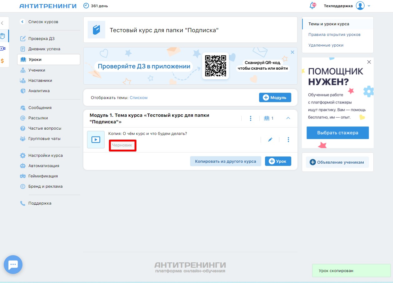 4. Готово, урок перемещен в необходимый курс как черновик. Вам остается зайти в только что скопированный урок, внести правки, если необходимо, и опубликовать его для учеников.