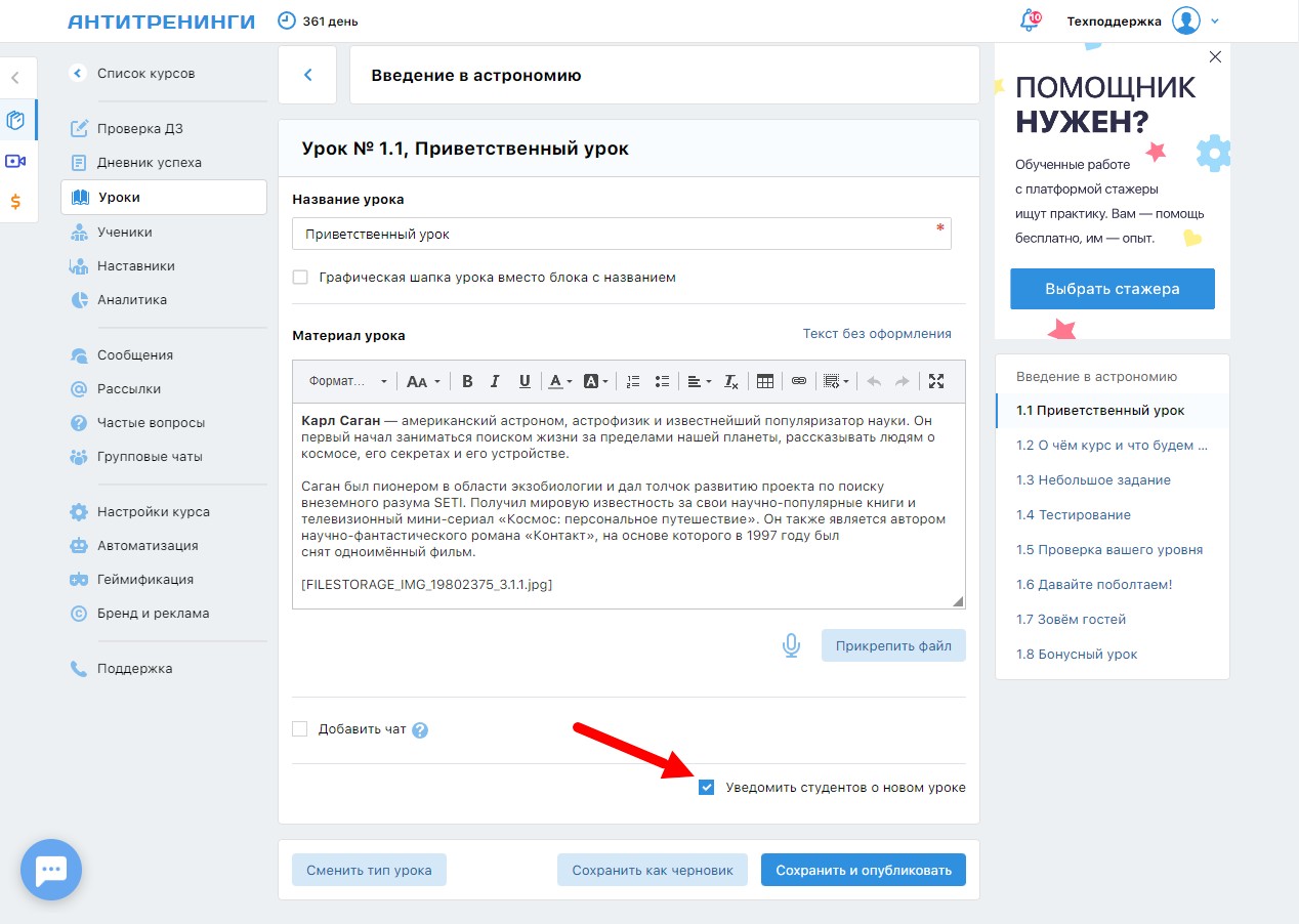 После создания урока и его последующего редактирования вы можете установить галочку напротив текста «Уведомить студентов о новом уроке». В этом случае, когда вы нажмете «Сохранить и опубликовать», то ученики, которые обучаются на курсе, получат уведомление на почтовый ящик о том, что в курсе доступен новый урок.