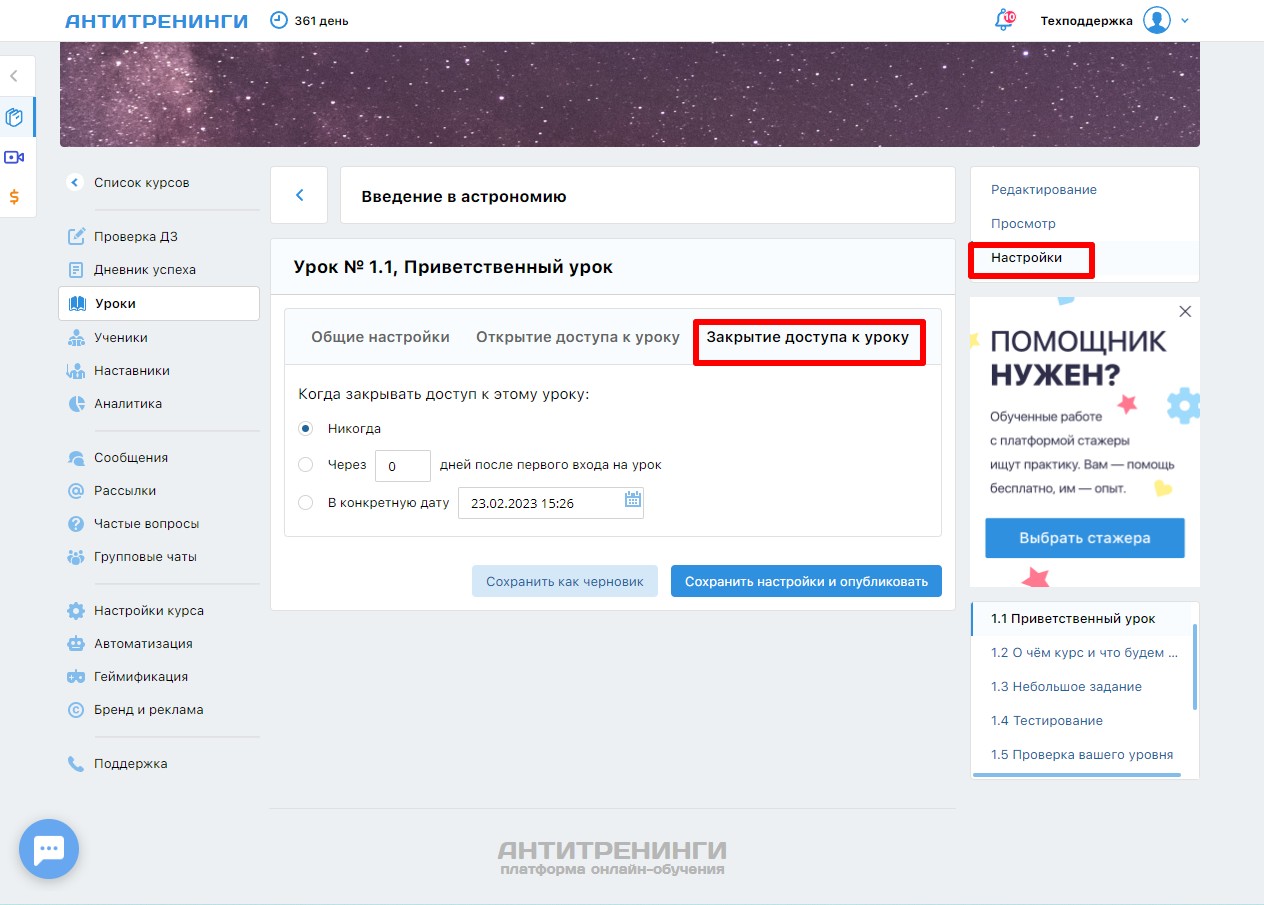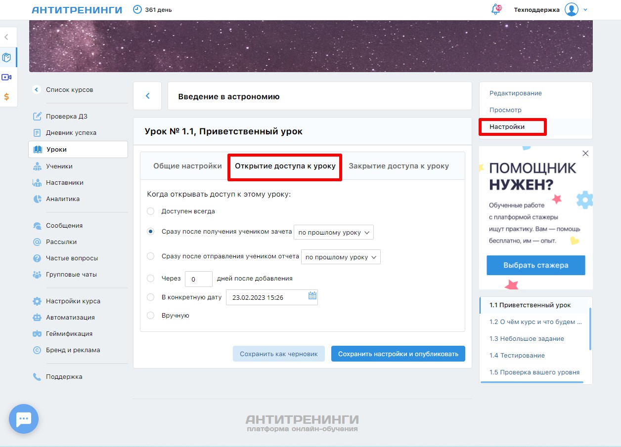 Задать параметры открытия ученику конкретного урока вы можете в «Настройках урока», раздел «Открытие доступа к уроку».
