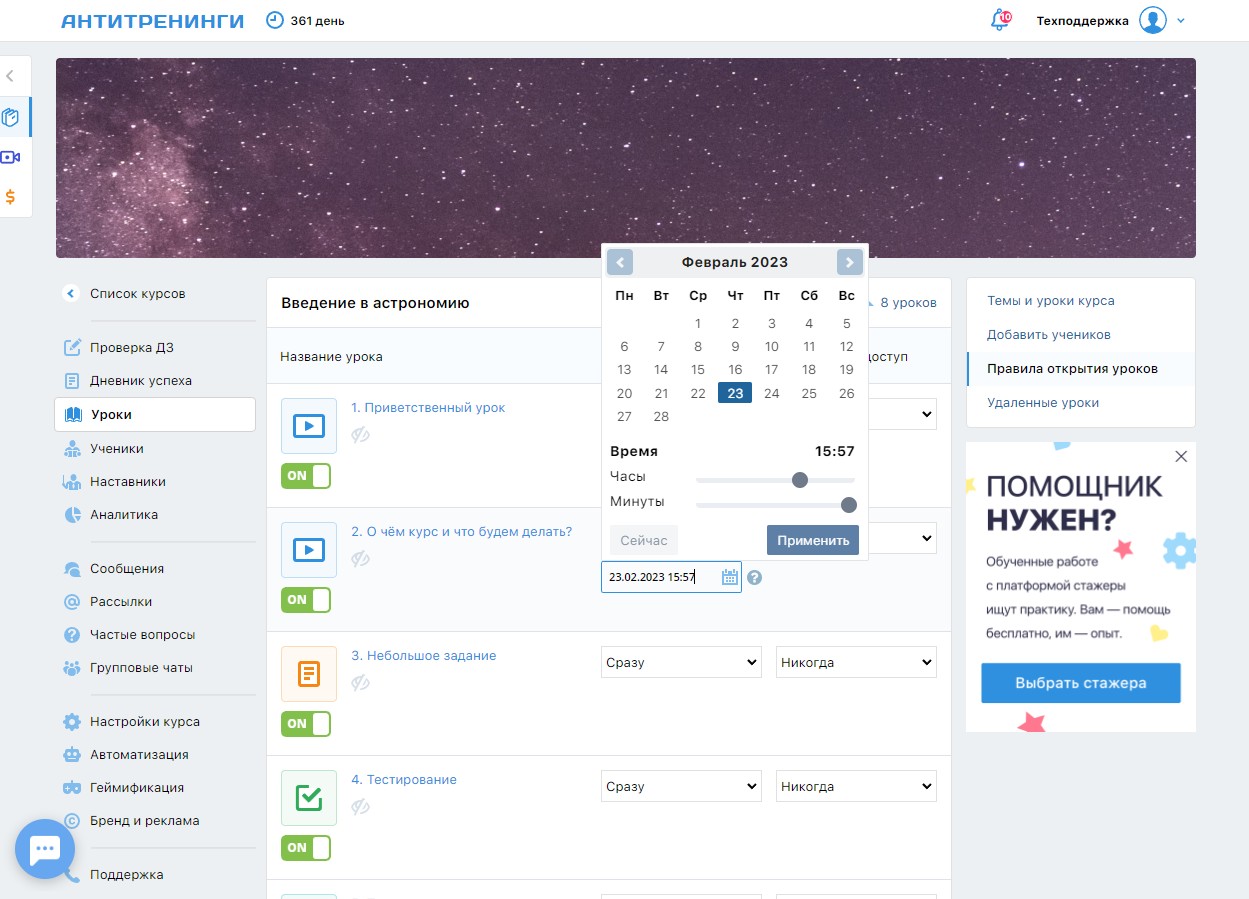 Платформа позволяет запланировать открытие уроков курса на определенную дату.
