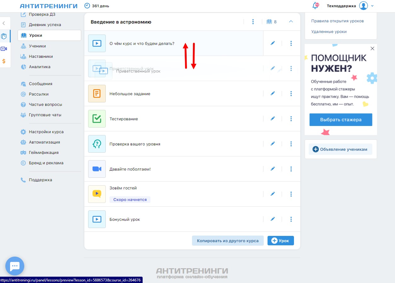 Если вам нужно поменять местами рядом стоящие уроки в курсе, поднять 10 урок, сделав его 2 или, наоборот, 3 опустить на 9 позицию, то вы захватываете нужный урок, нажав левую кнопку мыши, и перетаскиваете в нужное место.