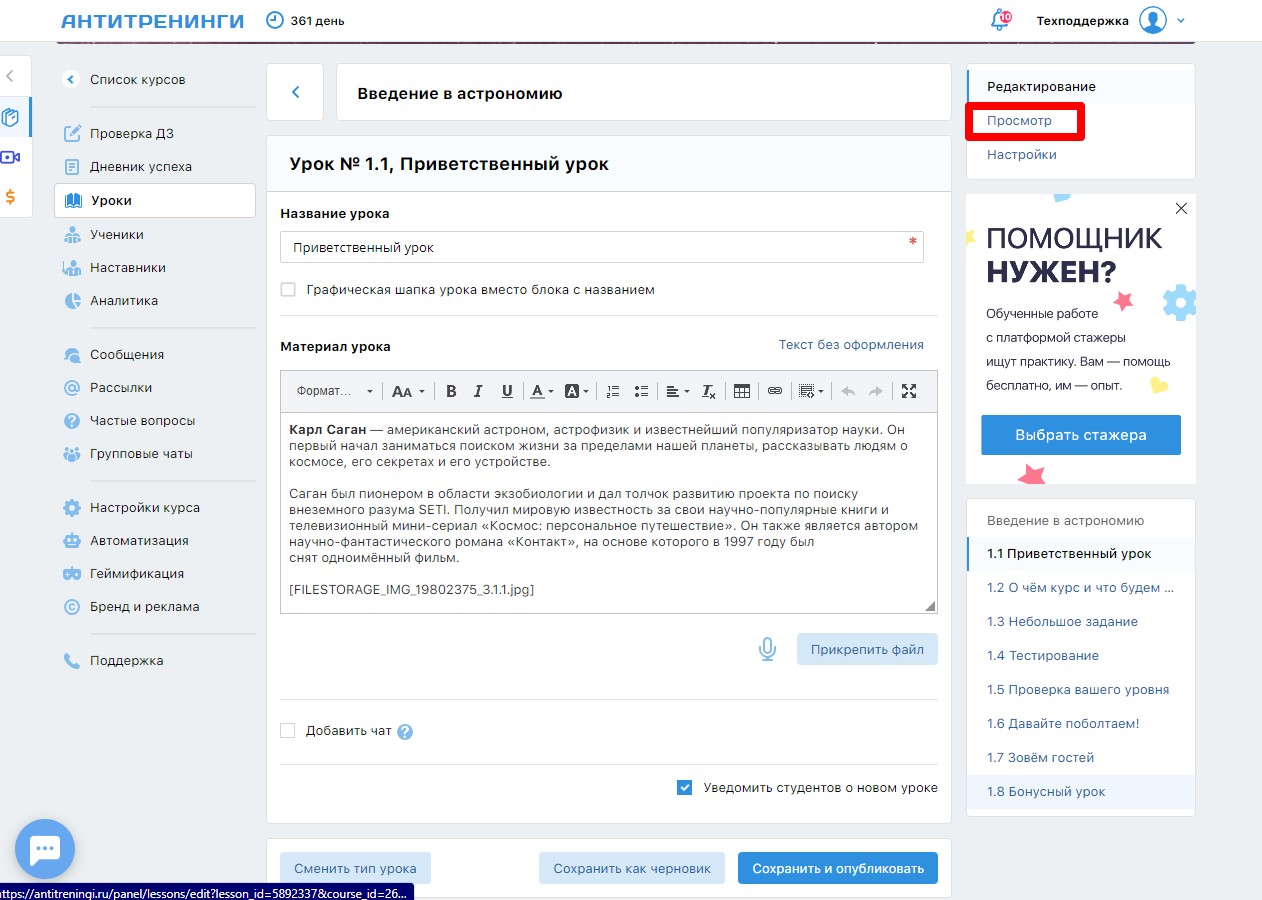Возможность посмотреть отображение урока и проверить форматирование, а также просмотреть его «глазами ученика» вы можете в режиме редактирования урока, перейдя в раздел «Просмотр».
