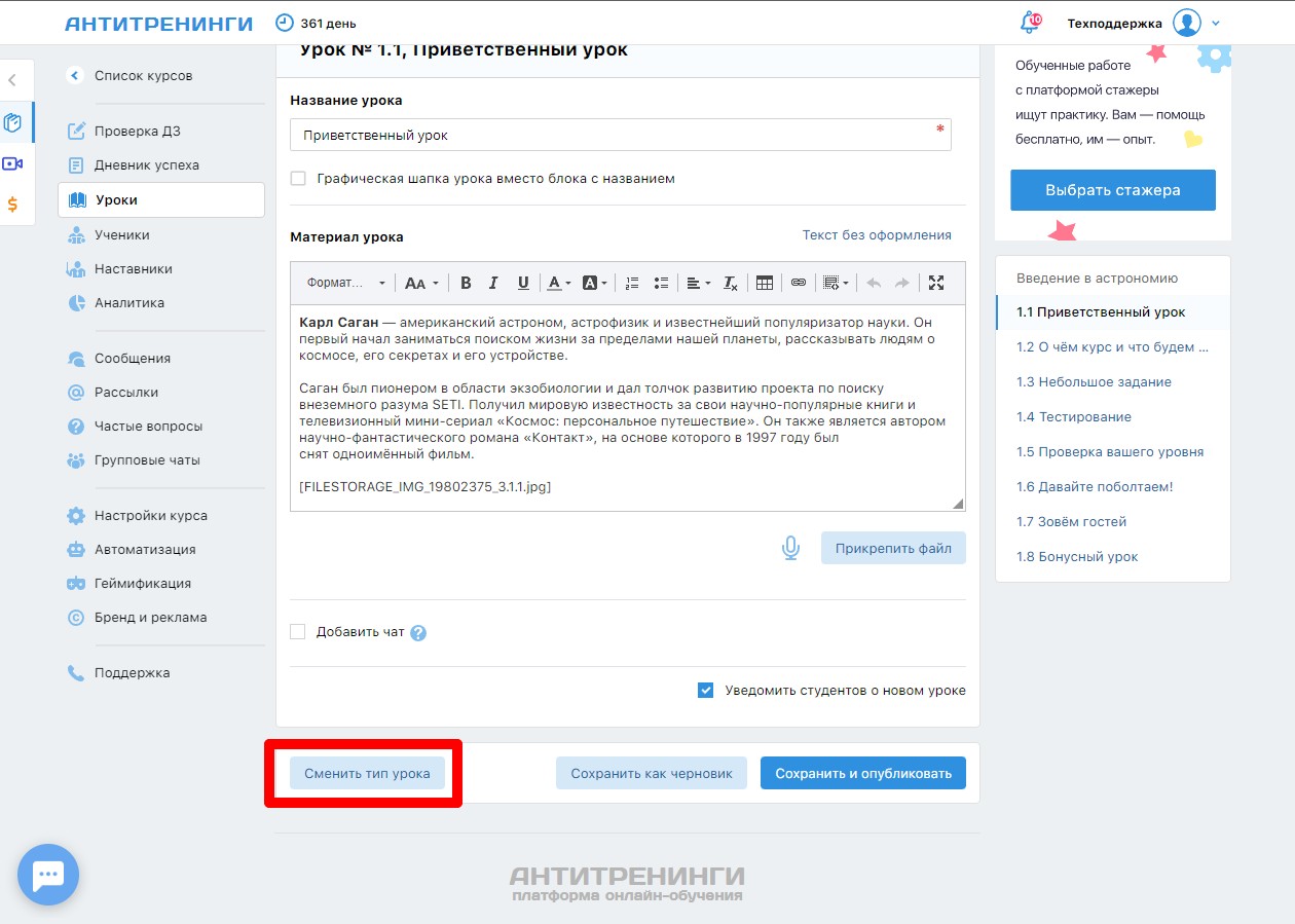 Вы можете сменить тип урока и выбрать другой необходимый вам из списка (теория, задания, тест или вебинар) на любом этапе создания урока. Для этого заходите в редактор урока и внизу страницы нажимаете кнопку «Сменить тип урока».