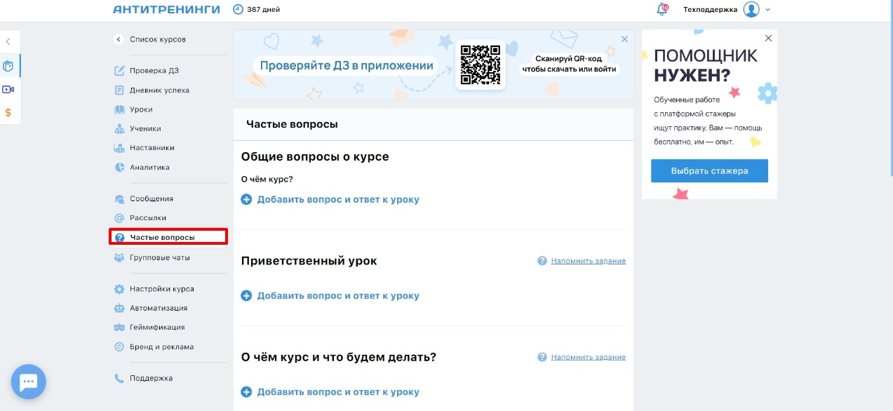 Раздел "Частые вопросы" позволяет ответить на самые популярные вопросы, возникающие у учеников во время обучения. Это могут быть общие вопросы о курсе или о уроке. Чтобы добавить вопросы и ответы, откройте раздел "Частые вопросы" и добавьте необходимые вопросы и ответы.
