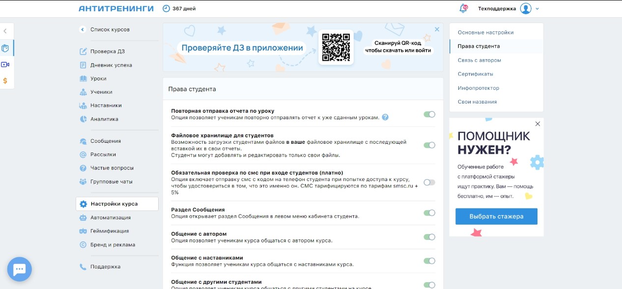 Чтобы ученики видели этот раздел, откройте раздел "Настройки курса", выберите вкладку "Права студентов" и нажмите на выключатель. После чего, у ученика в левом меню появится пункт "Вопросы" с вашими вопросами и ответами. Также, вопросы и ответы о конкретном уроке будут доступны в самом уроке.