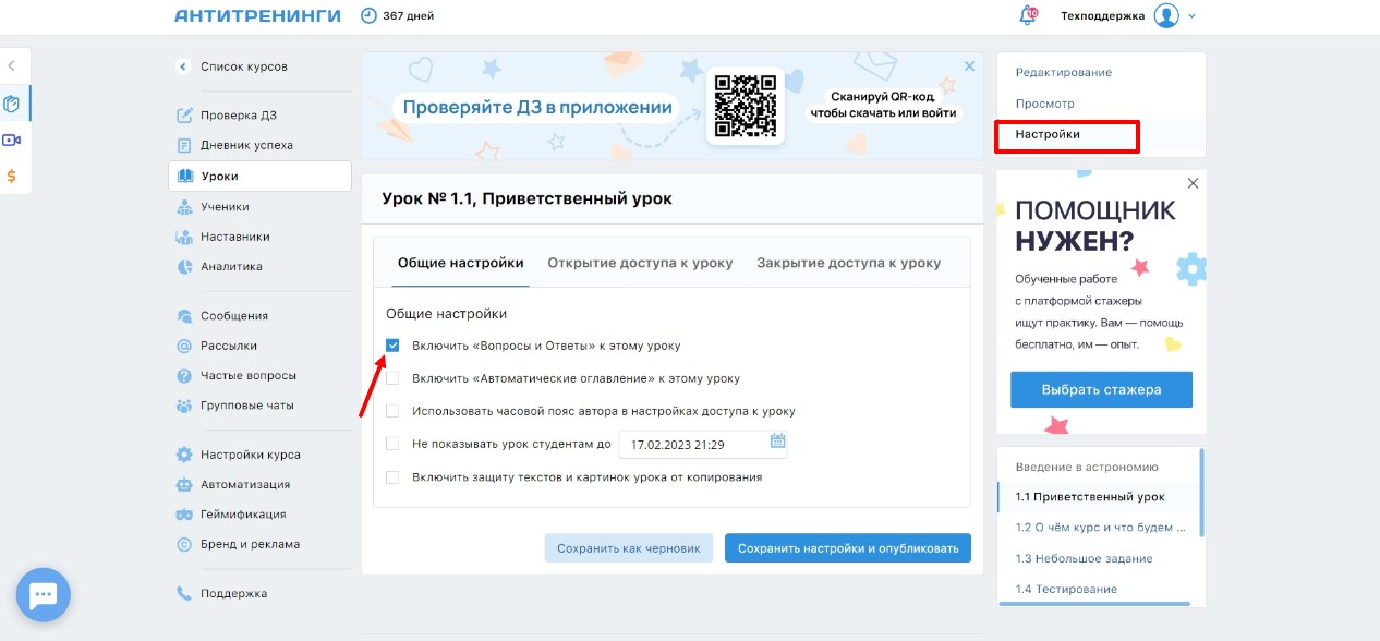 Чтобы включить отображение созданного вопроса и ответа к какому-то уроку, перейдите во вкладку "Уроки", зайдите в настройки нужного урока и включите галочку "Вопросы и Ответы к этому уроку".