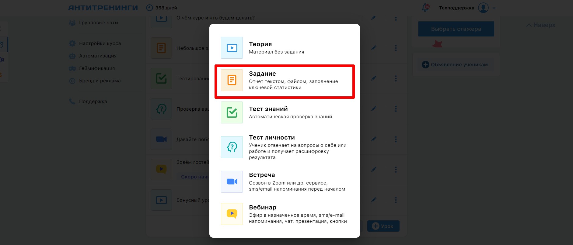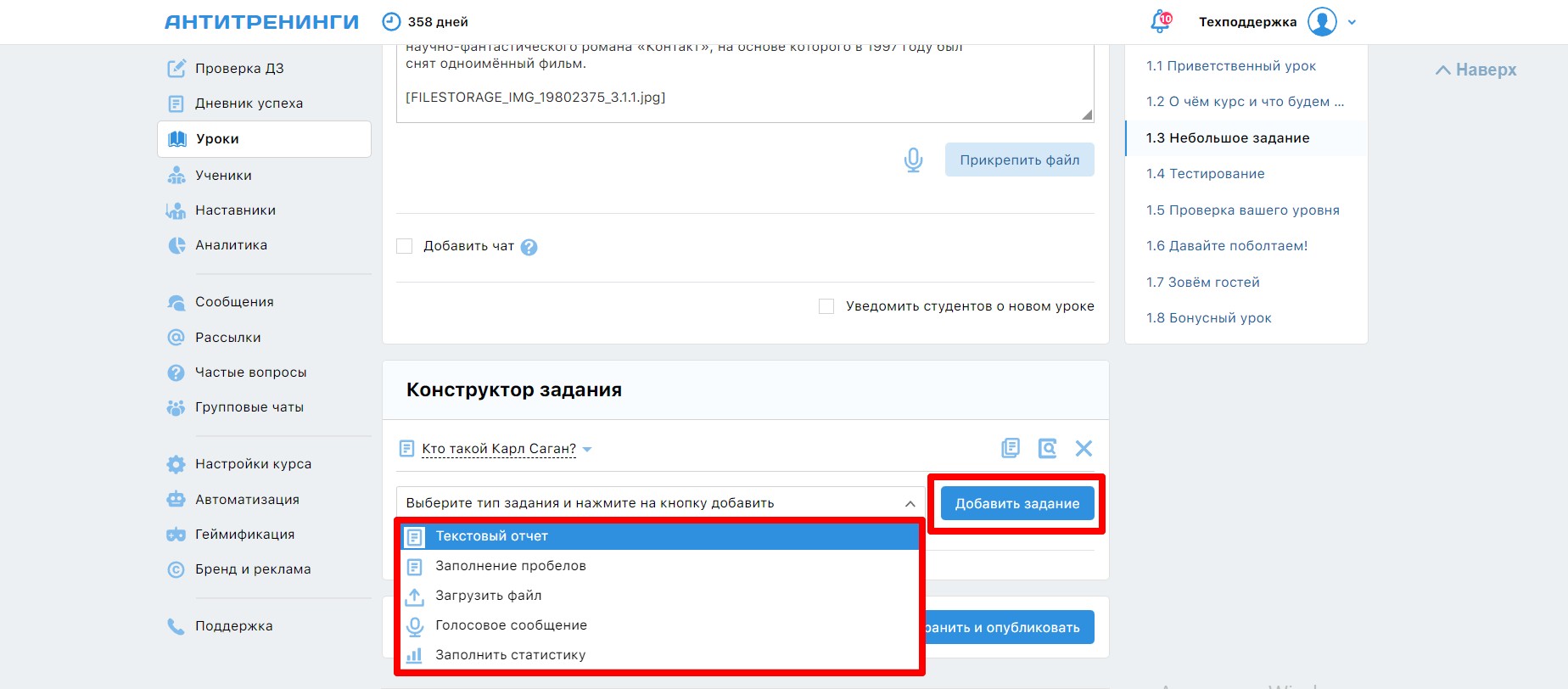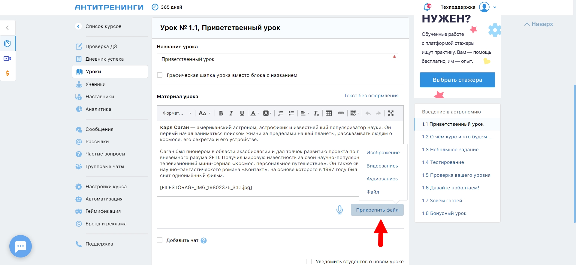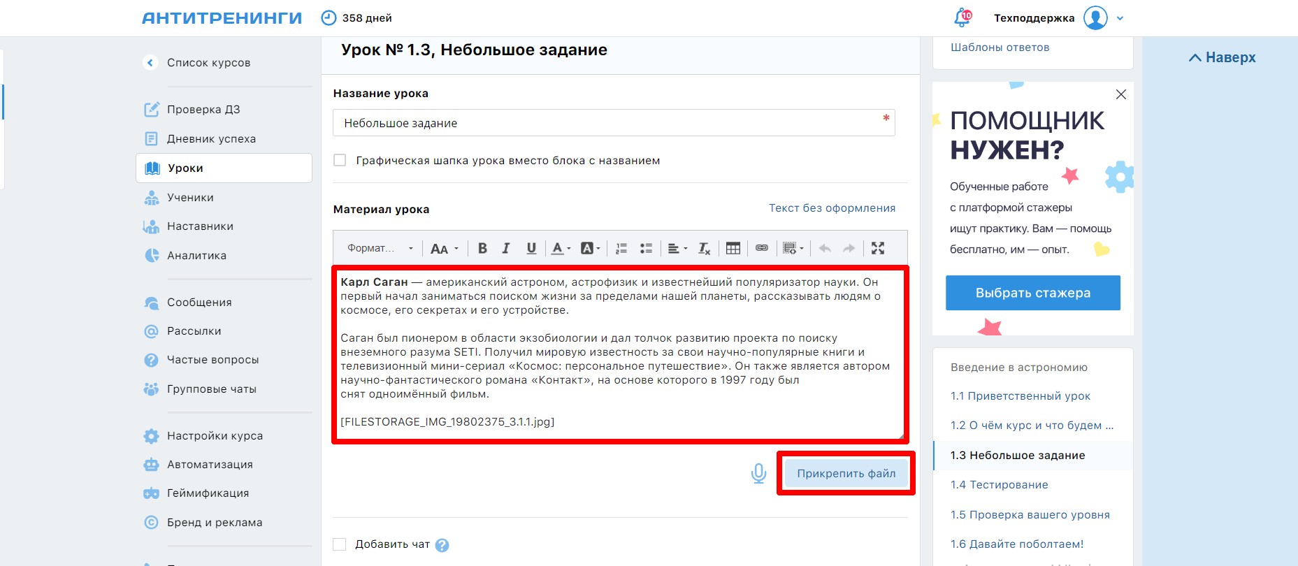 На платформе АнтиТренинги можно создать урок, который позволит не только изучить теоретический материал, но и закрепить полученные знания на практике, выполнив домашнее задание.