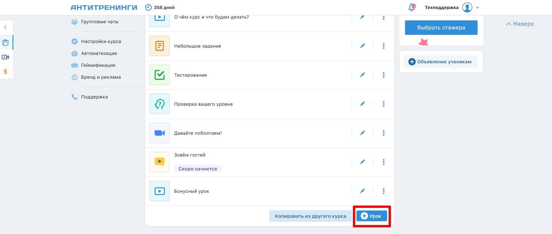 Чтобы создать урок с домашним заданием, необходимо зайти в ранее созданный вами курс.