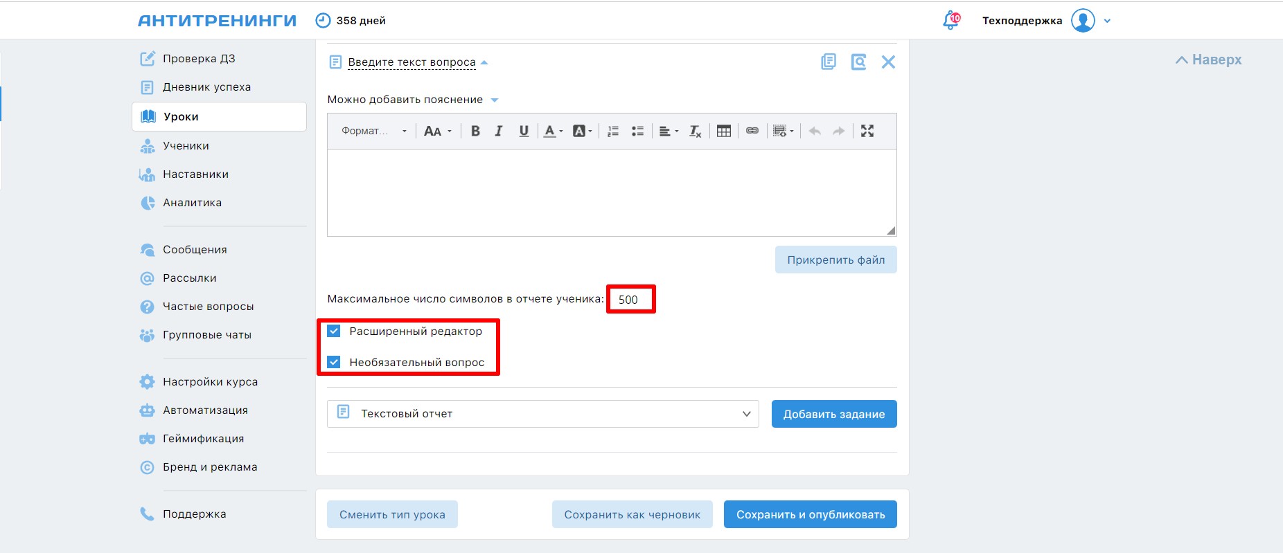 Если вы выбираете тип задания «Текстовый отчёт», то пункт «Расширенный редактор» позволит подключить расширенную панель редактирования поля, как у Автора.