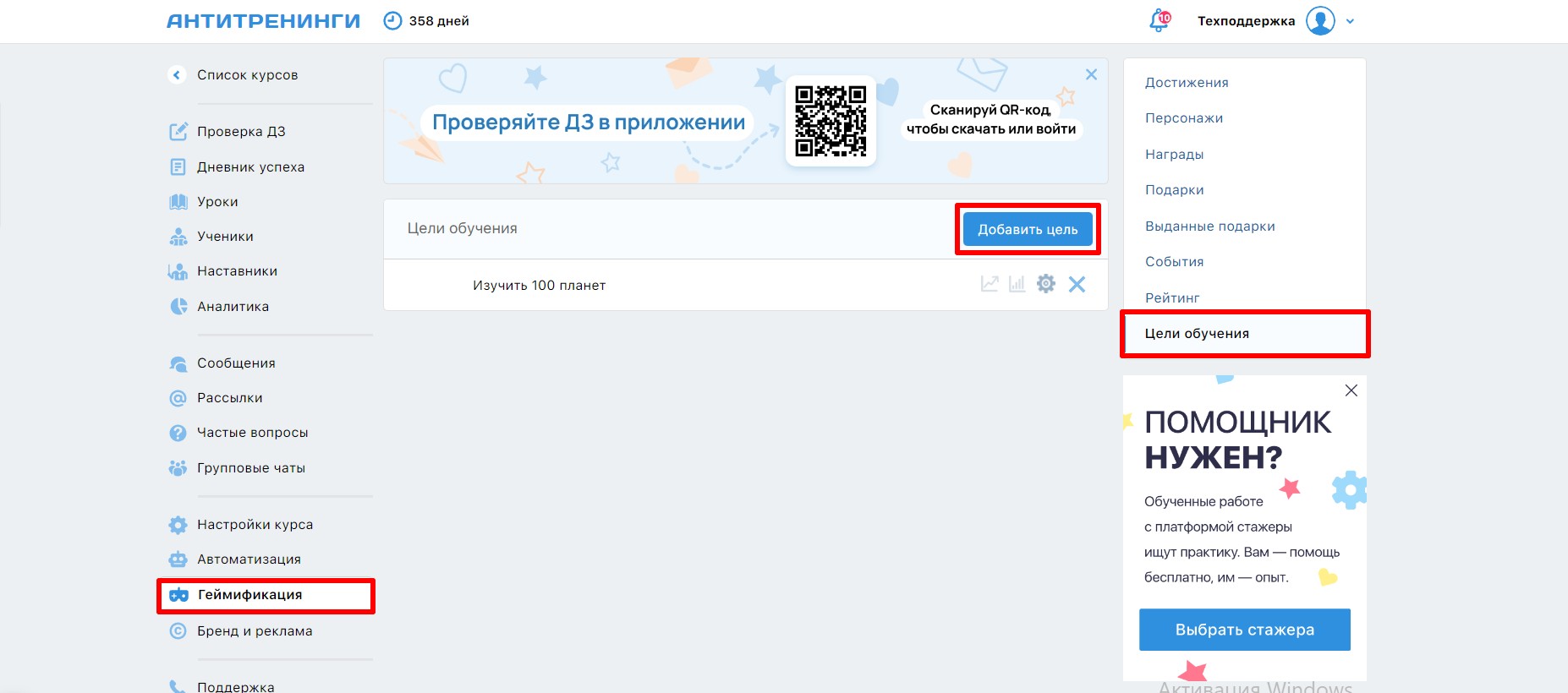 Для использования типа задания «Заполните статистику» предварительно нужно настроить «Цели обучения» в разделе «Геймификация» -> пункт меню «Цели обучения».