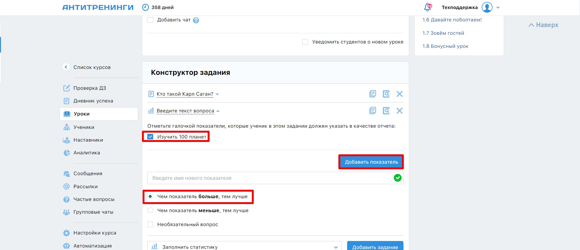 Поле «Добавить еще показатель» дает возможность собирать статистику по дополнительным показателям. Введите название вашего показателя, выберите нужный параметр и нажмите «Enter/Ввод» на клавиатуре. Выберите созданный показатель галочкой для использования в уроке.