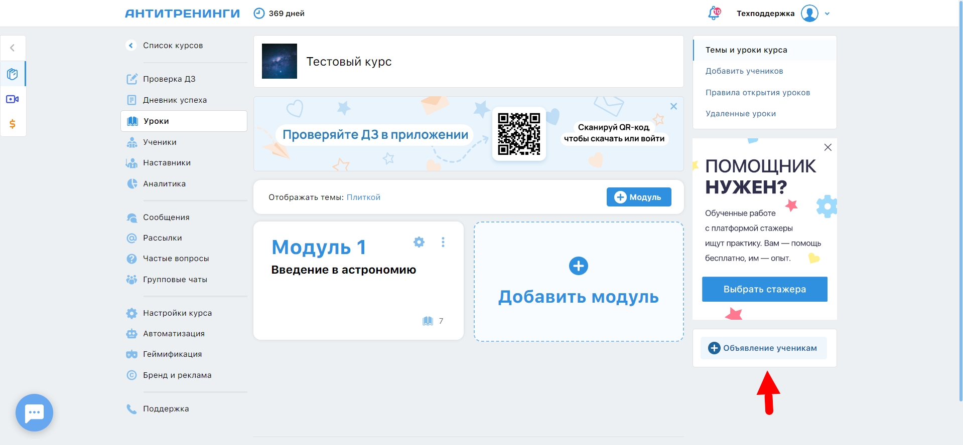 Также, в разделе "Уроки" можно добавить объявление. Для этого в блоке справа нажмите на кнопку "+ Объявление ученикам". Объявление будут видеть все, кто имеет доступ к курсу. Отображаться оно будет над списком модулей.