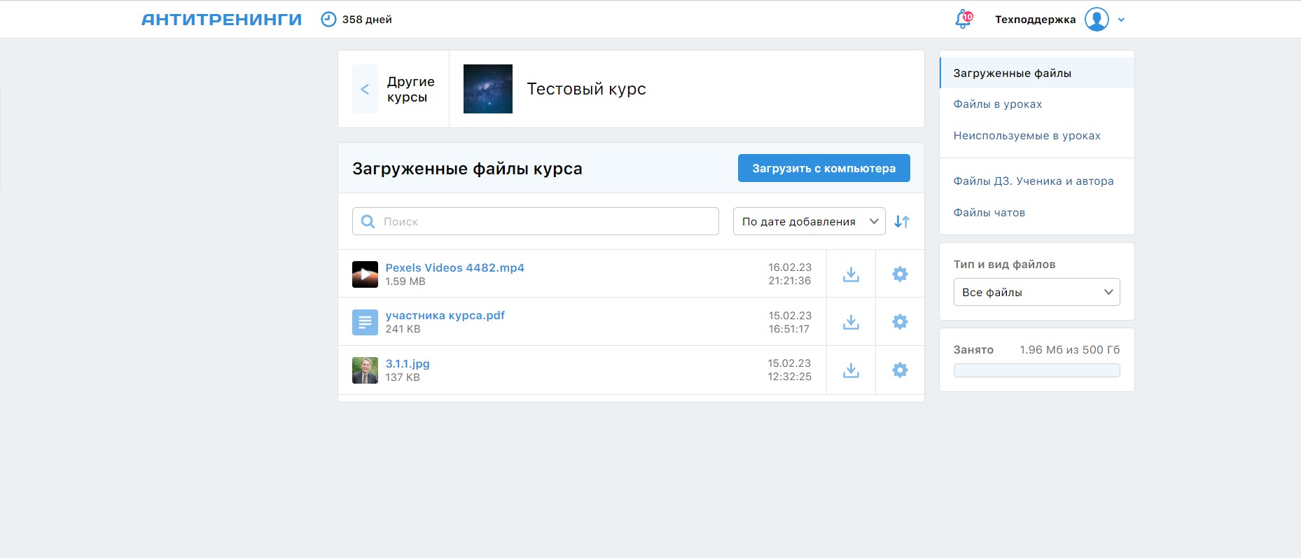 Перед вами открываются «Загруженные файлы конкретного курса» и появляется кнопка «Загрузить с компьютера».
