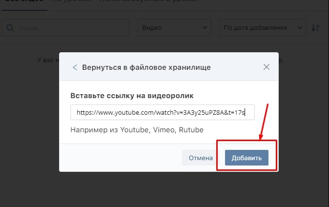 И вставляете ссылку на видео с адресной строки другого ресурса. Нажимаете кнопку «Добавить».