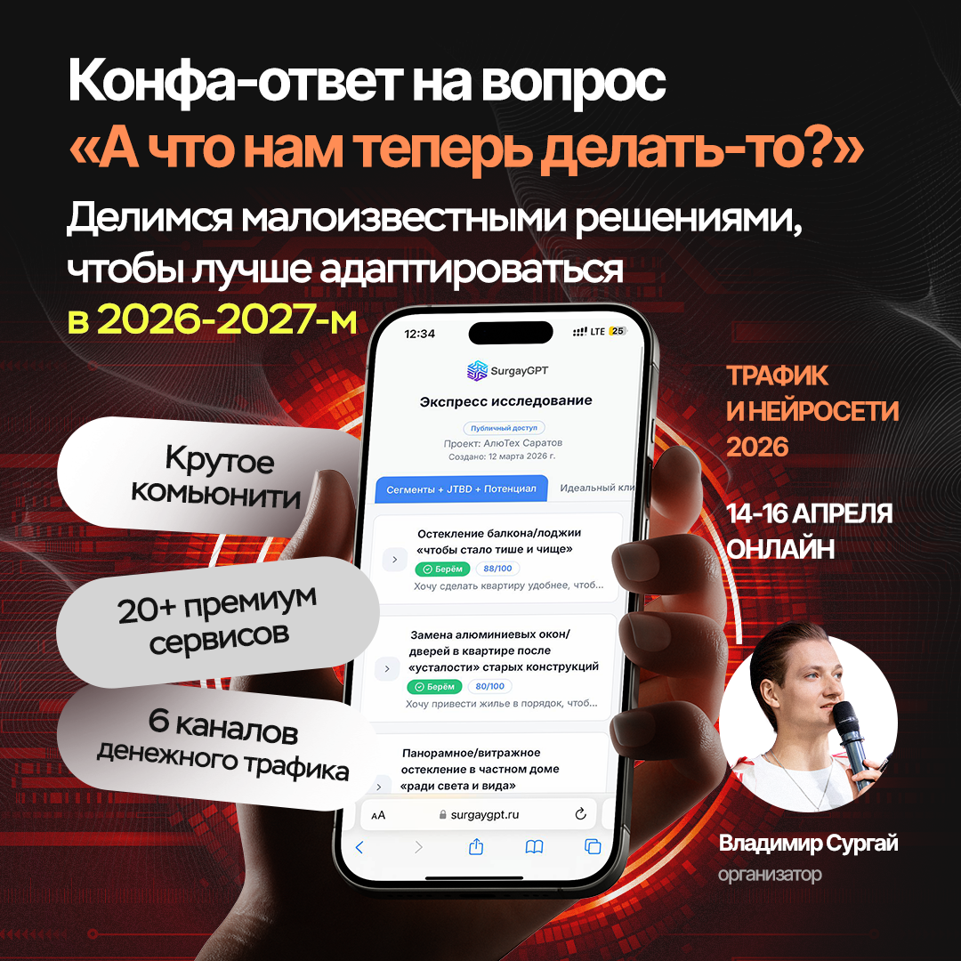 С 14 по 16 апреля пройдет онлайн-конференция «Трафик и нейросети 2026», где мы с 20+ спикерами поделимся ПРАКТИКОЙ по привлечению клиентов в этом году